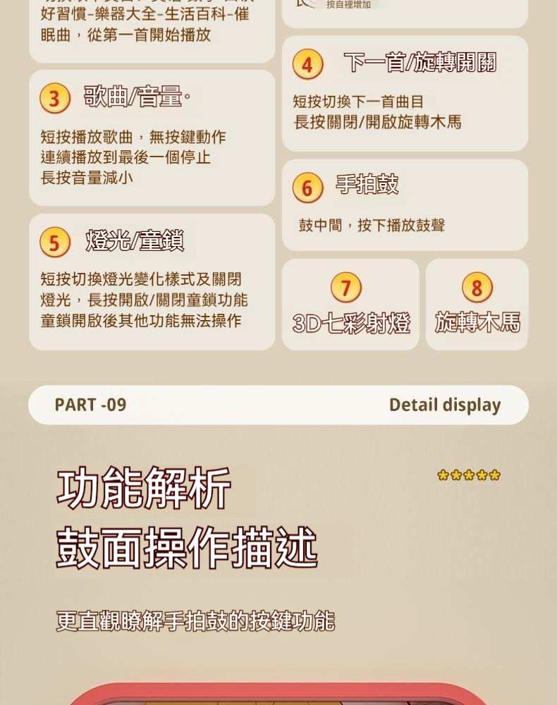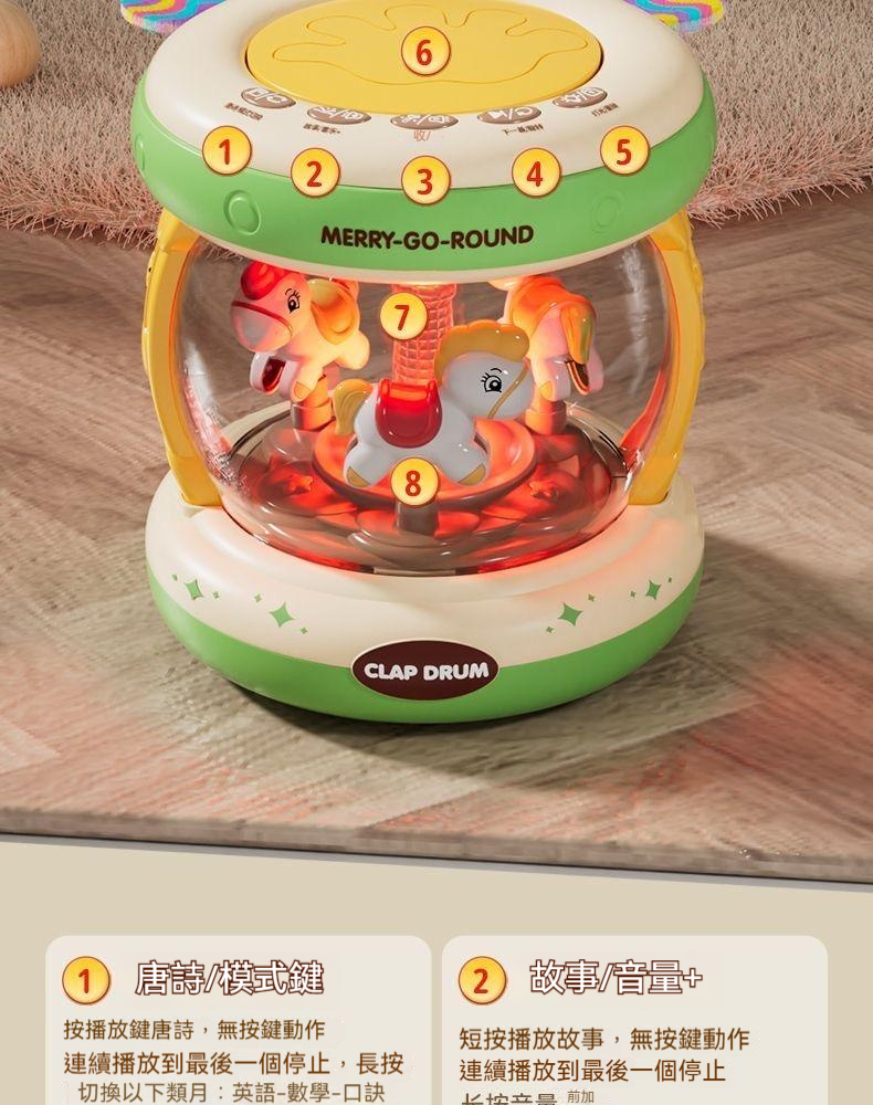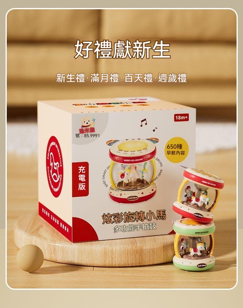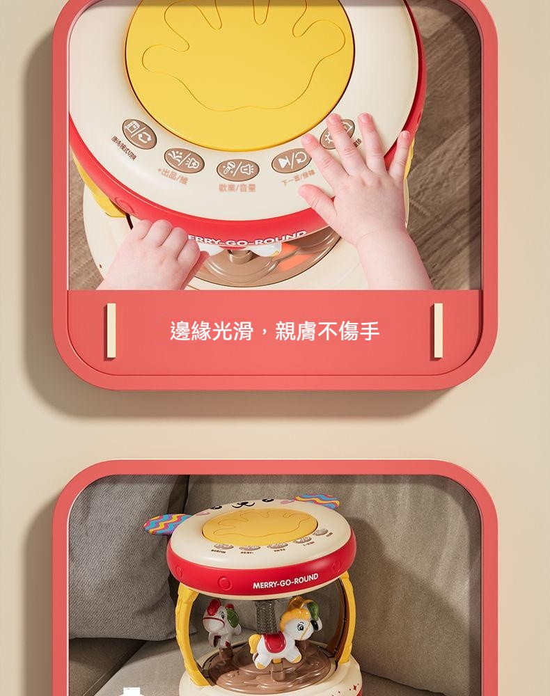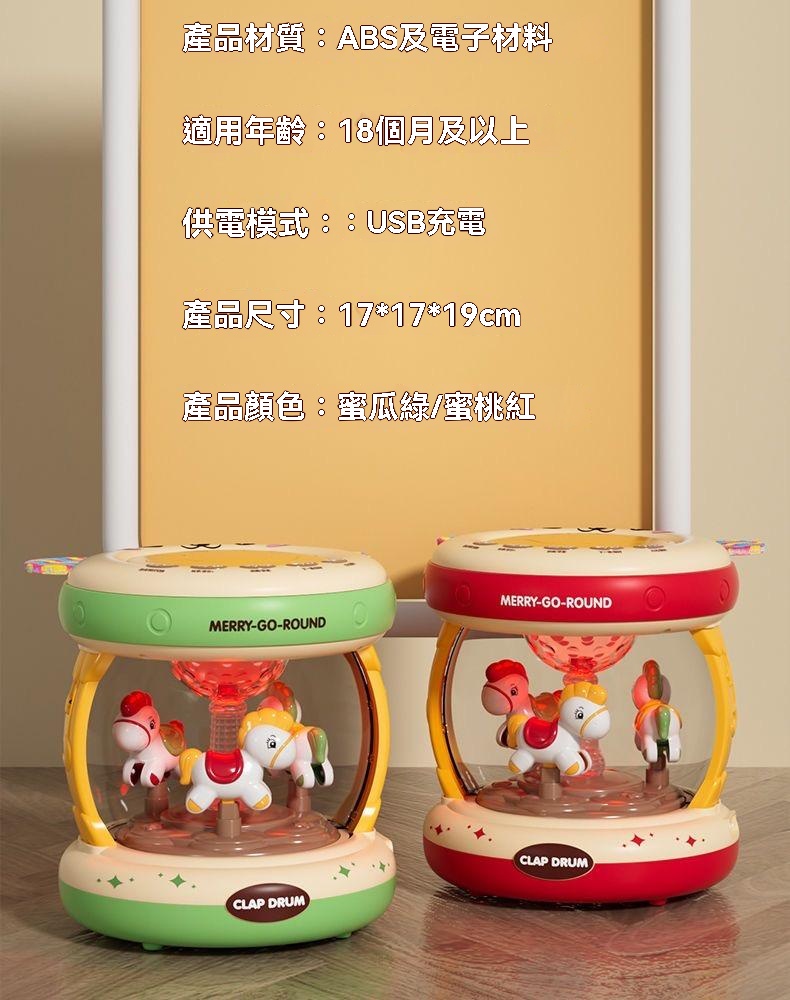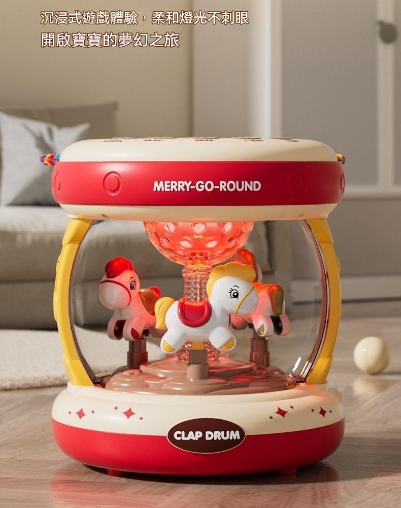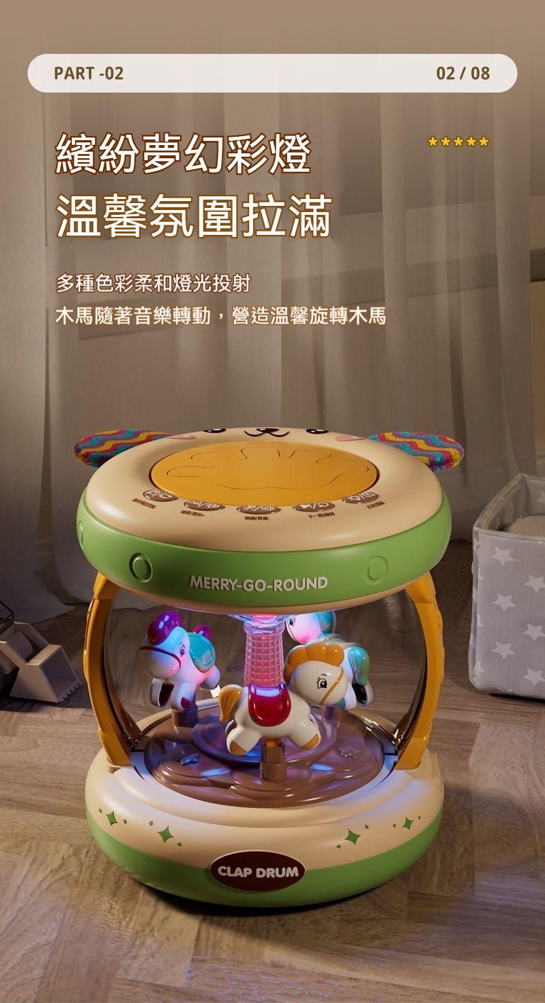 寶寶的多功能旋轉木馬手拍鼓來了!旋轉木馬+音樂燈光秀,可手拍,可充電✅360度旋轉木馬✅採用環保ABS材質 ✅功能豐富---兒歌+音樂+燈光+童話故事等
