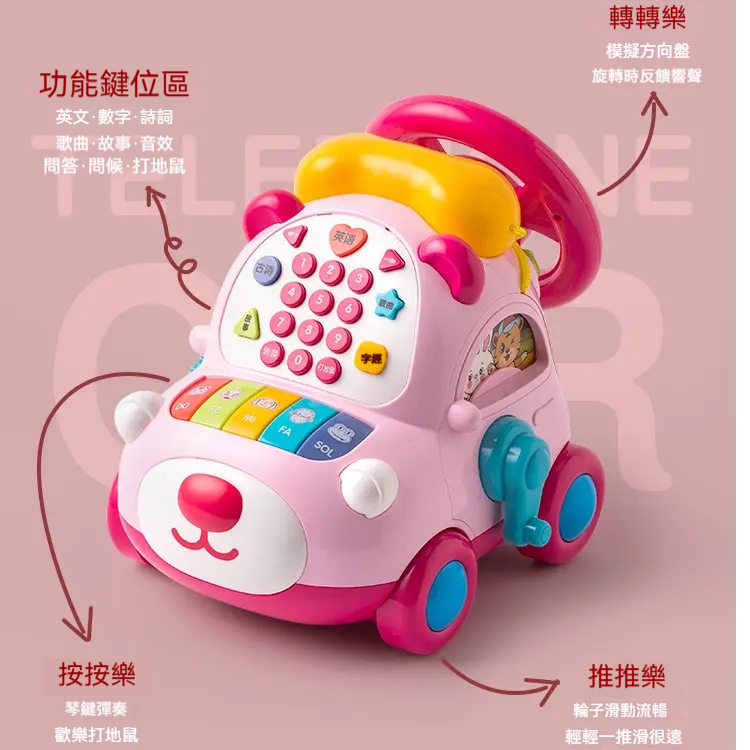 寶寶的高級玩具來咯來咯---多功能電話車,功能豐富,可數字啟蒙認知+早教 ✅多種娛樂玩法,故事+打地鼠等 ✅ABS材質,無毒無異味 ✅趣味方向盤,可加減檔 ✅耐用電池+可充電式